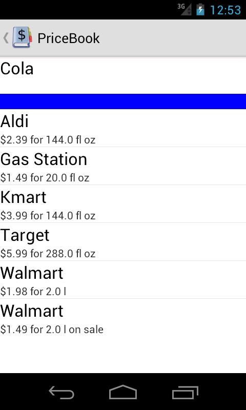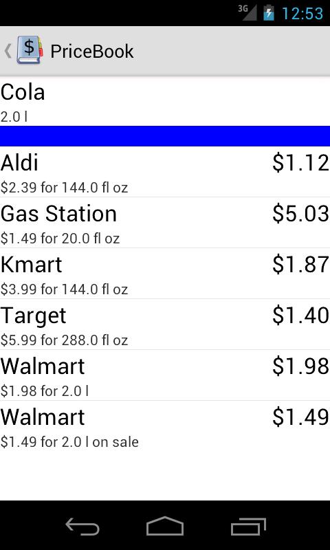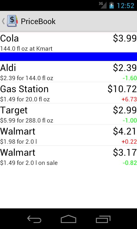 Simple Pricebook will take all of your comparisons and put them in perspective of the quantity you're looking at. So if I'm looking at 2 liters of soda, it will compare against that 144 fl oz of soda (12 pack of cans), in a "2 liter" manner. It will tell me the total price of the comparison and the difference. The difference is color-coded. Green means it's cheaper and red means it's more expensive.
