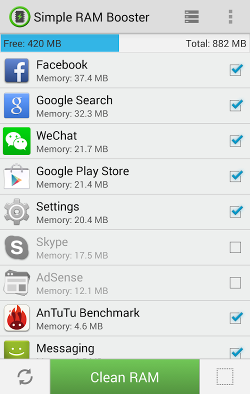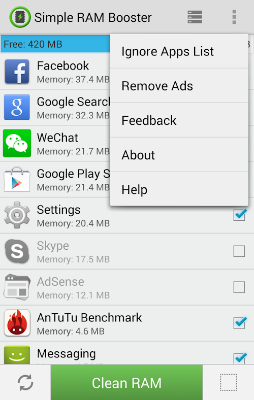 Just tap on Clean RAM in the notification shade and the process will begin in the background. Single tap to get your phone working faster. Preferences for ignored apps will be intact and only the apps not on the list will be killed to gain memory. Get direct access to app through notification shade, by enabling "Notification Bar Icon" in Settings.
