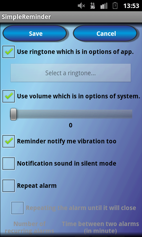 Notication is highly configurable. With Simple Reminder you can easily set an alert that will be repeated periodically. All of notifications you can set another alarm sound, vibrate, volume and repeat properties.