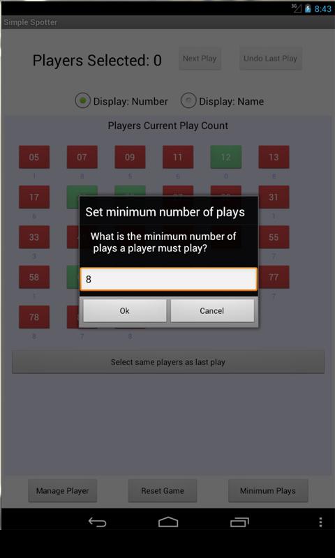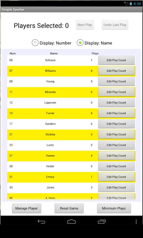 Under each players jersey number you will see the total number of plays left that a player still need to do. You can also list the players by their name and select any player to manually change the total number of plays left. So for example if a player is injured and out for the game, you can change their play count to 0. When a player reaches their required minimum number of plays, the color of their number will change to green. This allows you to quickly see who still has plays remaining.