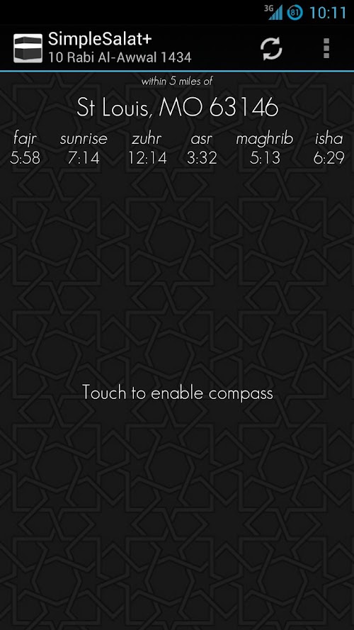 If prayer times are slightly off, please adjust calculation method under Settings. Note that SimpleSalat+ uses YOUR specific coordinates to calculate prayer times, so it may be more accurate.