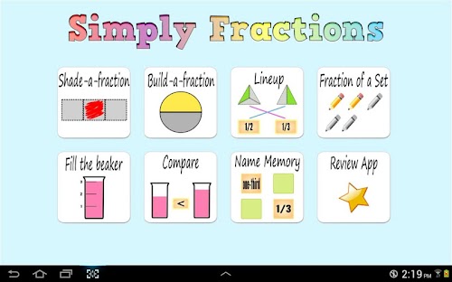 Find Fractions too abstract? Is Math hard and boring? Not when you can see and play your way through the concept. Simply Fractions will help elementary school aged children understand and grasp the concept of fractions through hundreds of fun exercises.
