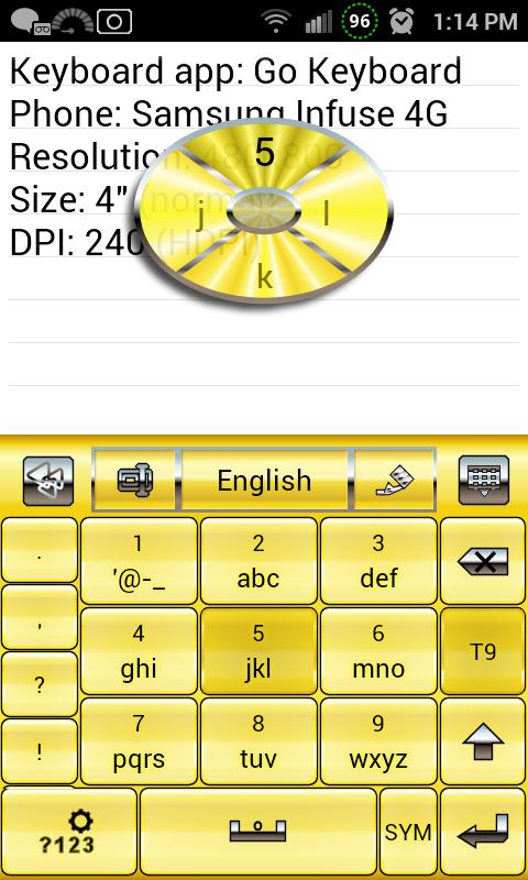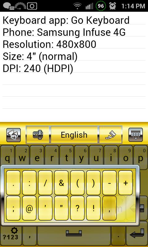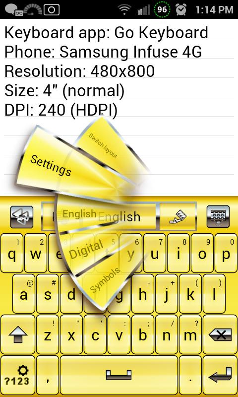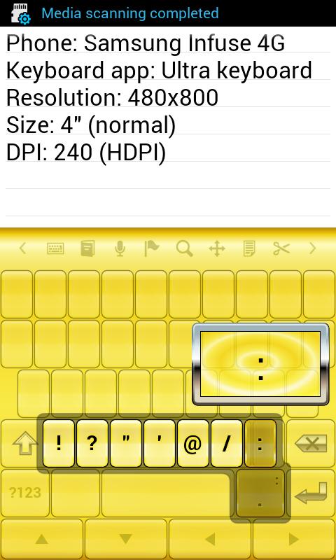 The skin also includes a test area for you to type in to test the skin (after setting up your keyboard app to use the skin). You can long press the test area to select different input methods to see how the skin looks using the compatible keyboard apps you have installed on your Android.