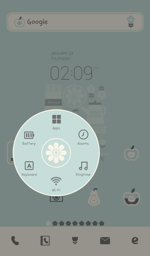 ** Open the launcher menu by swiping the home screen upwards, select the [Theme] menu, them select and apply the theme of your choice.