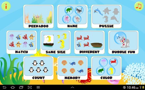 Simply Sea Life for Toddlers is a set of 10 educational games designed for toddlers to learn basic skills while playing. Your little one will be delighted by the adorable sea animals and learn their names (in English), play the classic peekaboo game, blow and pop bubbles, along the way they will learn colors, counting (1 to 10), distinguish same and different, as their fine motor skill improves, they can play the peg puzzle game, the match and memory game will enhance their logical thinking skills.