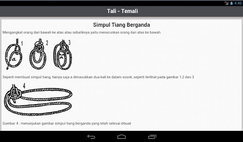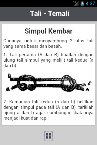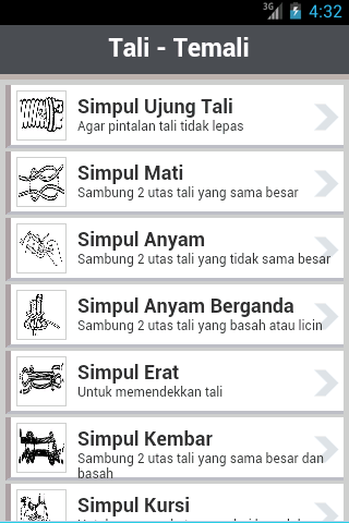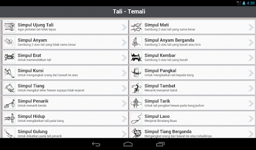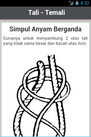 Aplikasi ini adalah panduan dasar dalam belajar membuat bermacam-macam jenis simpul dalam tali-temali yang disertai gambar ilustrasi yang kami kumpulkan dari beberapa sumber.