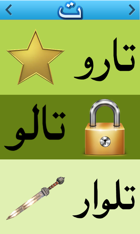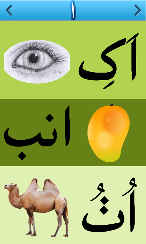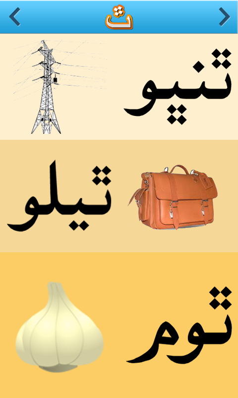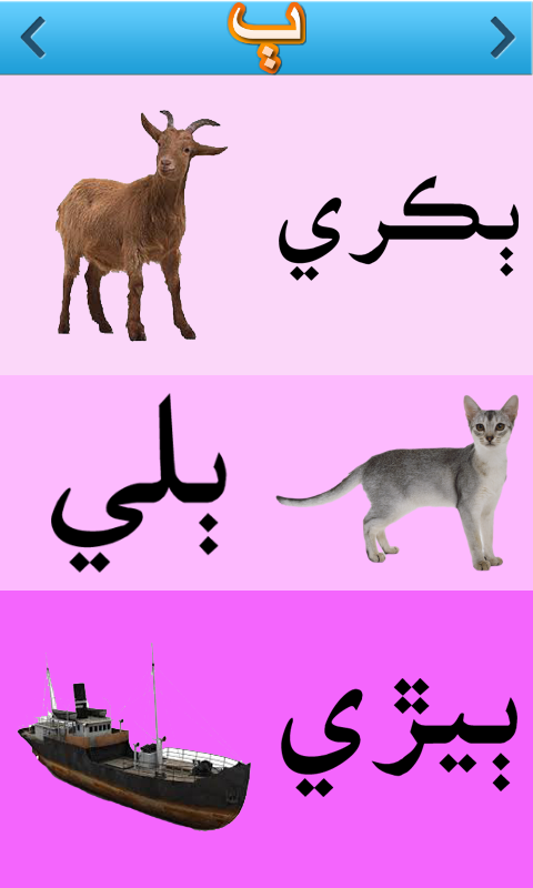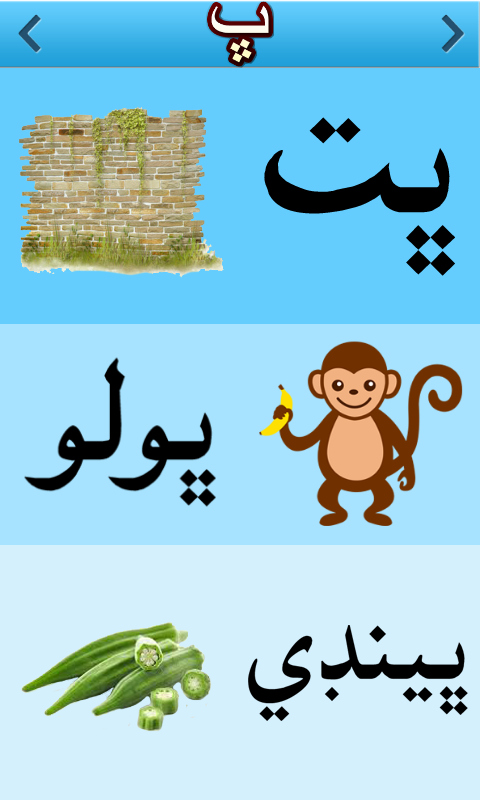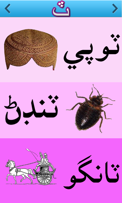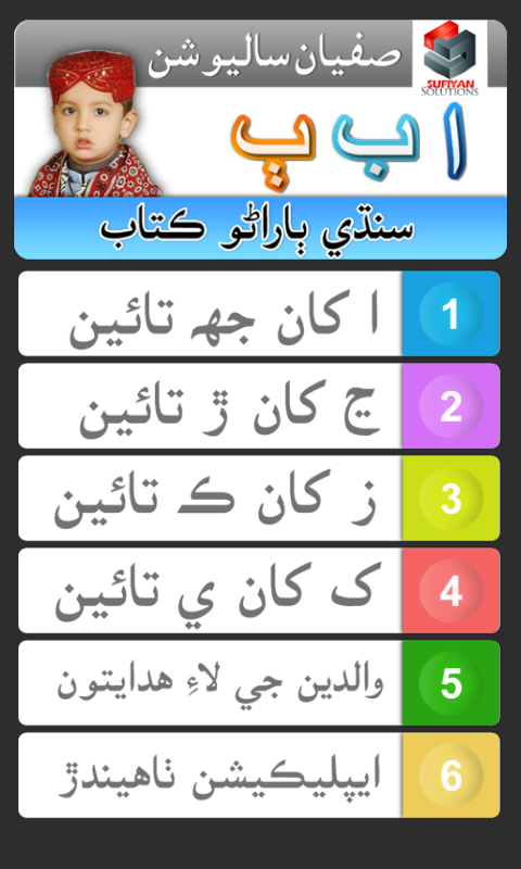 kids learn through figures of objects, words in sindhi/english, and sindhi pronounciations,