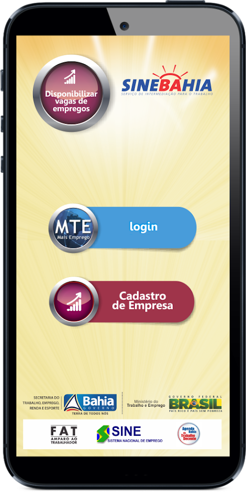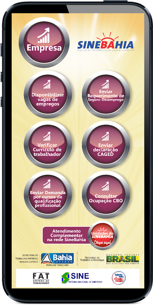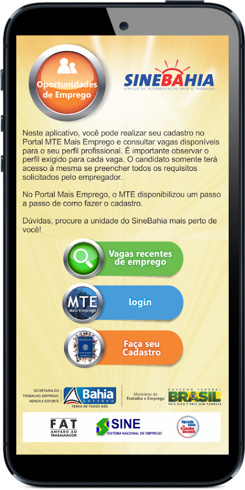 O Portal MTE Mais Emprego é a base de dados do aplicativo do SineBahia. É nesta plataforma que estão disponibilizados serviços para o trabalhador e para a empresa de toda a rede Sine do país. No entanto, este APP traz ainda informações, com endereços e serviços de toda a Rede SineBahia, o SineBahia-Patra e o Programa de Microcrédito – CrediBahia, oferecendo oportunidades também para o trabalhador autônomo.The MTE More Jobs Portal is a database of SineBahia application. It is on this platform that services are available for the employee and for the company's entire network Sine the country. However, this still brings APP information with addresses and all SineBahia Network services, SineBahia-Patra and the Microloan Program - CrediBahia, also offering opportunities for the self-employed.