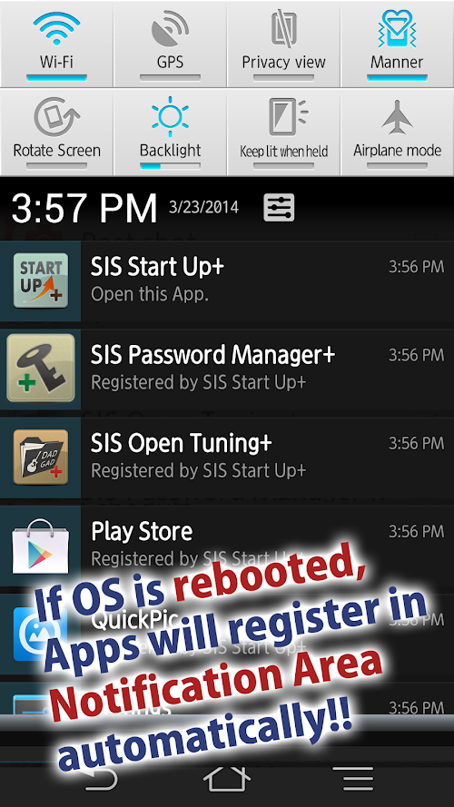 Please use this App in case "application, which has been registered in the notification area disappears when you restart Android OS" and/or you want to register some Apps in the Notification Area (the Apps do not have the function to register them in the Notification Area).