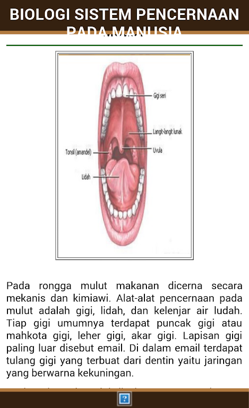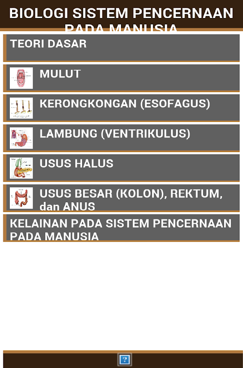 aplikasi ini menjelaskan tentang sistem pencernaan pada manusia, dari makanan masuk kemulut, lalu dicerna dan diserap lalu dikeluarkan di anus hingga penyakit pada sistem pencernaan di jelaskan di aplikasi iniThis application describes the human digestive system, from the food into the mouth, and then digested and absorbed and then released in the anus to diseases of the digestive system described in this application