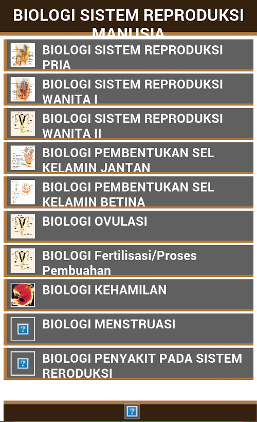 aplikasi ini menjelaskan tentang sistem reproduksi pada manusia, baik pria maupun wanita, bahkan hingga fertilisasi (pembuahan) hingga penyakit pada sistem reproduksi di jelaskan di aplikasi iniThis application describes the human reproductive system, both men and women, even until fertilization (conception) to diseases of the reproductive system described in this application