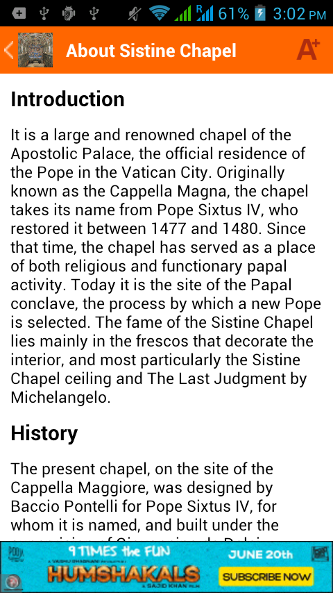 Monuments are the pride of the country they belong to. This Sistine Chapel app will provide you all the details about the famous monument. The Sistine Chapel is situated in Vatican City and is a large and renowned chapel of the Apostolic Palace, the official residence of the Pope. Today it is also the site of the Papal conclave, the process by which a new Pope is selected.. The fame of Michelangelo's paintings has drawn multitudes of visitors to the chapel and if you get a chance you should also go admire the beauty of the place.