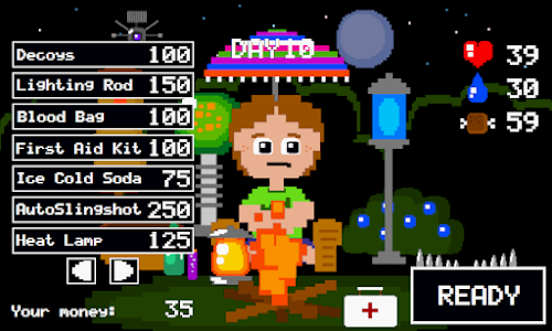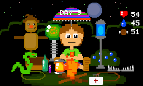 See how many days you can survive while sitting alone in the wilderness! At the beginning of each day you can buy supplies for the night, and you'd better spend your money wisely because you'll need protection from mosquitoes, bats, bears, snakes, zombies, rain, acid rain, meteors, lightning, ghosts, and more! Choose from three difficulty settings then see how long you can last!