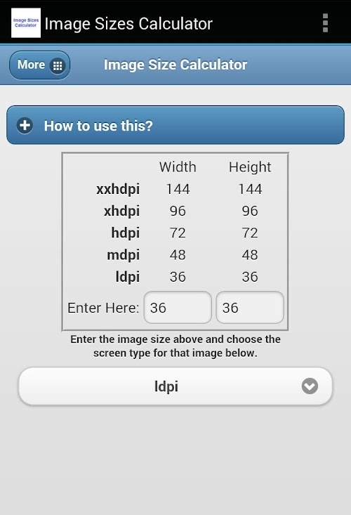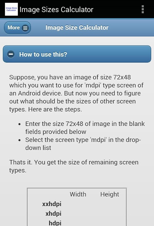 Suppose, you have an image of size 72x48 which you want to use for 'mdpi' type screen of an Android device. But now you need to figure out what should be the sizes of other screen types. Here are the steps.