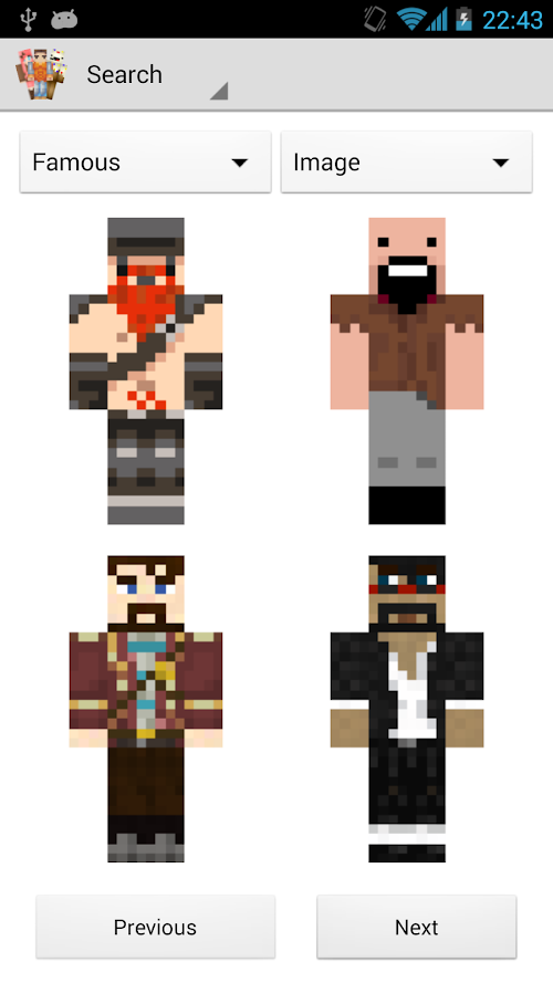 Skins for Minecraft has a catalogue of skins for you to choose from. You can apply any skin to either the Pocket Edition of Minecraft or the PC Edition of Minecraft. There are over 400 skins to choose from!