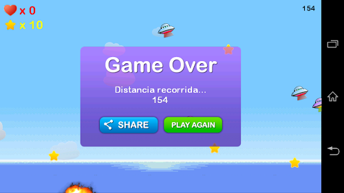 Adictivo juego de tipo arcade en el que tendrás que intentar mantener el avión en vuelo durante la mayor distancia posible mientras esquivas Ovnis cada vez más veloces que intentarán detenerte. ¡Mientras más estrellas recojas por el camino más lejos conseguirás llegar!Addicting arcade game where you have to try to keep the plane airborne for maximum distance while dodging increasingly fast UFOs that try to stop you. The more stars you collect along the way get further directions!