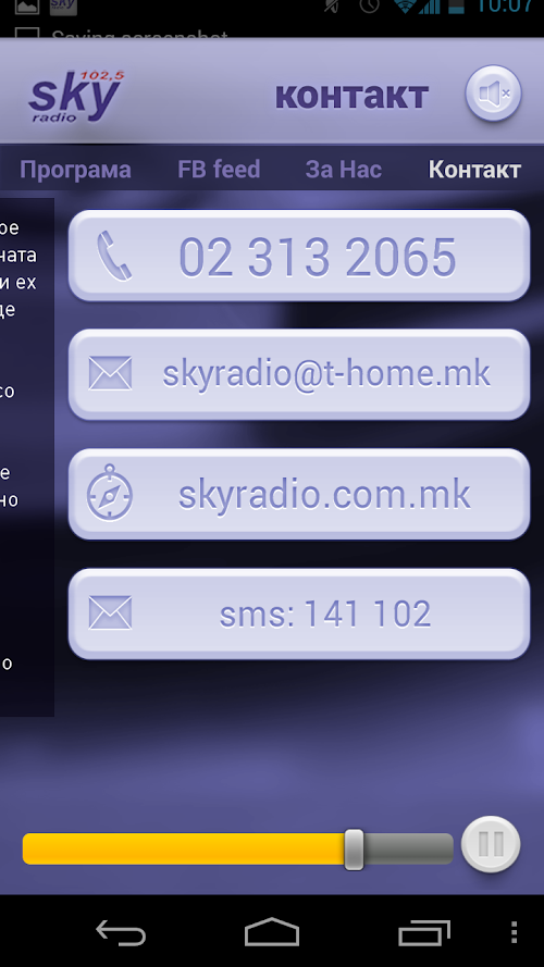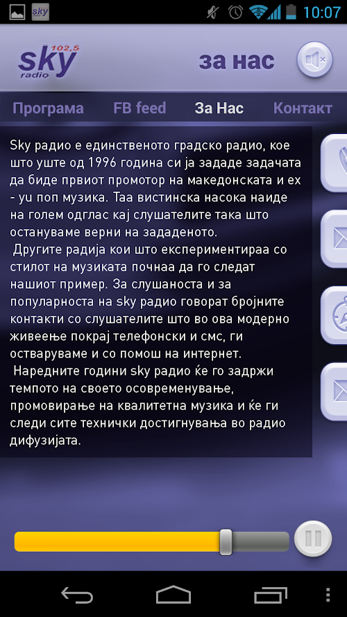 Also this application allows you to learn more about Macedonian SkyRadio 102.5 FM, a weekly radio program, to see all the latest Facebook announcements, and get in touch with a direct call or with sending SMS message to SkyRadio 102.5 FM.