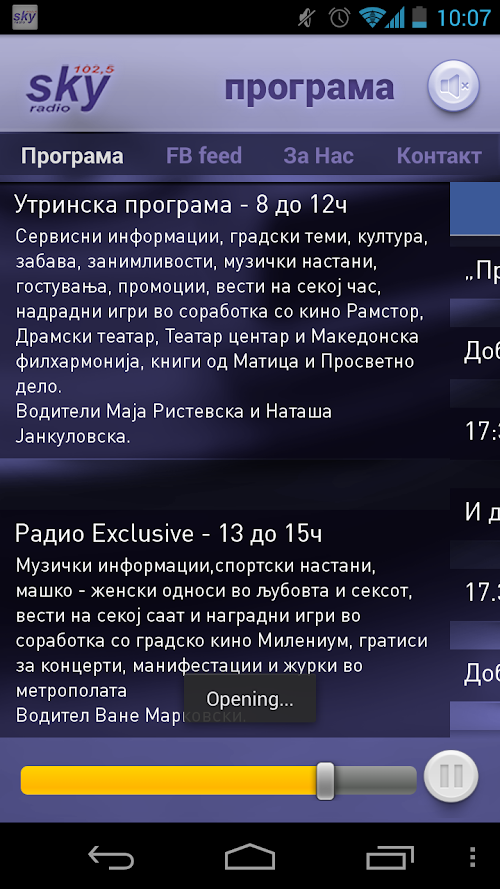 SkyRadio 102.5 FM is mobile application through which you can listen to your favorite radio wherever you have an Internet connection, no matter where you are.