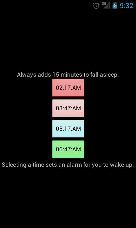 By using the proper sleep cycle at night, you will feel more refreshed when you wake up. Your body is typically already in a half awake state during a REM cycle. This application just calculates when these typically occur!