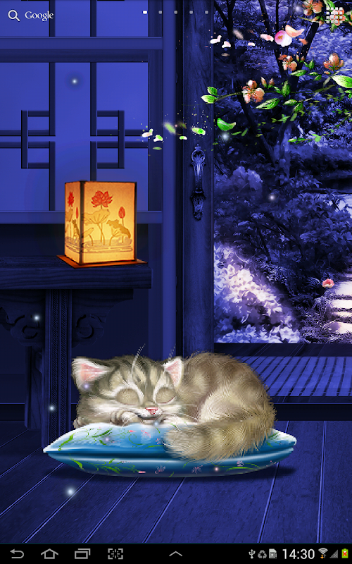 Enjoy our beautiful live wallpaper “Sleeping Cat Live Wallpaper” for Android phones and tablets with super cute sleepy kitten, eastern night background, glowworms and falling sakura petals.