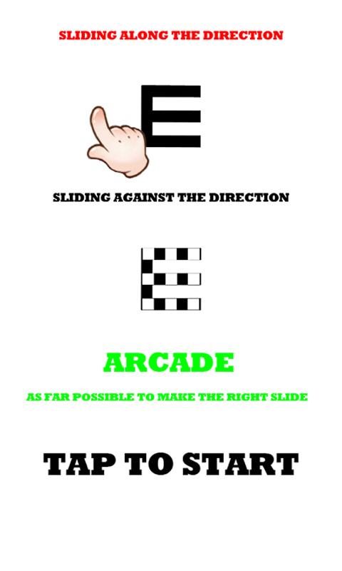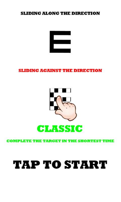 Slide One Slide is a test of agility casual gamers eyesight and creative games. Remember the vision test? In accordance with the "E" in the opening direction of the activities of the finger is passed, otherwise fail! Carefully special color "E" Oh, you need to slide your finger in the opposite direction. Rush time, do not forget to use the rockets to destroy all the stones help you. Divided into classic, arcade, time three modes test players wit! Come on, visual acuity together it!
