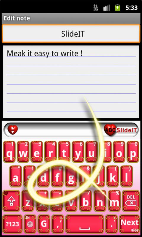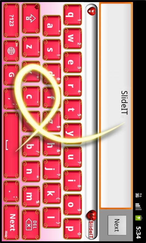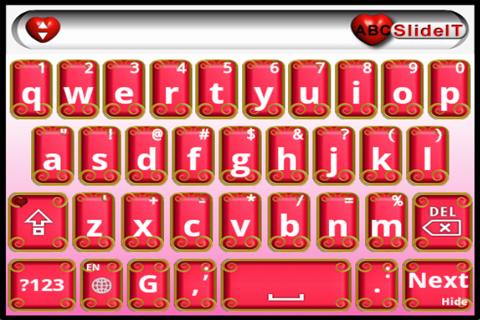 This is a skin addon to change the look of the SlideIT keyboard to be Red and pink hearts with golden edges.