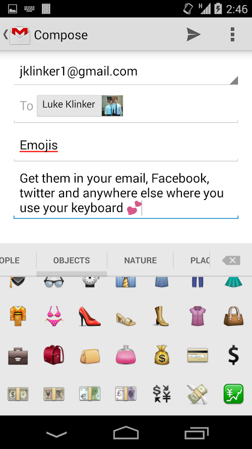 NOTE: This app will NOT actually show the emojis in the text box or on the device unless your system supports them! Please understand this! We have no way to add support for that from this app. If you would like to get that working, you will have to have a rooted phone and change the system font to one that supports Google's emojis.
