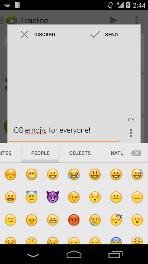 As I said above, you won't be able to see all the emojis on the device! Sometimes they will show up as a blank space and usually they will show up as aiona black and white image of the selected emoji. THIS IS FINE. THEY WILL SEND CORRECTLY to all your friends that have support for them (again, iOS users and any Android messaging apps that have the emojis in them).