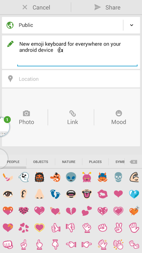 NOTE: This app will NOT actually show the emojis in the text box or on the device unless your system supports them! Please understand this! We have no way to add support for that from this app. If you would like to get that working, you will have to have a rooted phone and change the system font to one that supports Google's emojis.