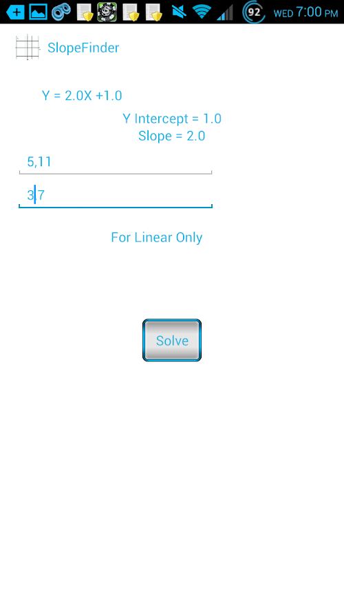 Hate finding the slope and y intercept of a line from 2 points or Want to check your answers to make sure they're correct? This app can do just that enter 2 points as x,y and hit solve and it will give you a linear equation. Great for students and teachers wanting to improve their math skills. DOES NOT SHOW WORK BUT PRO VERSION WILL.