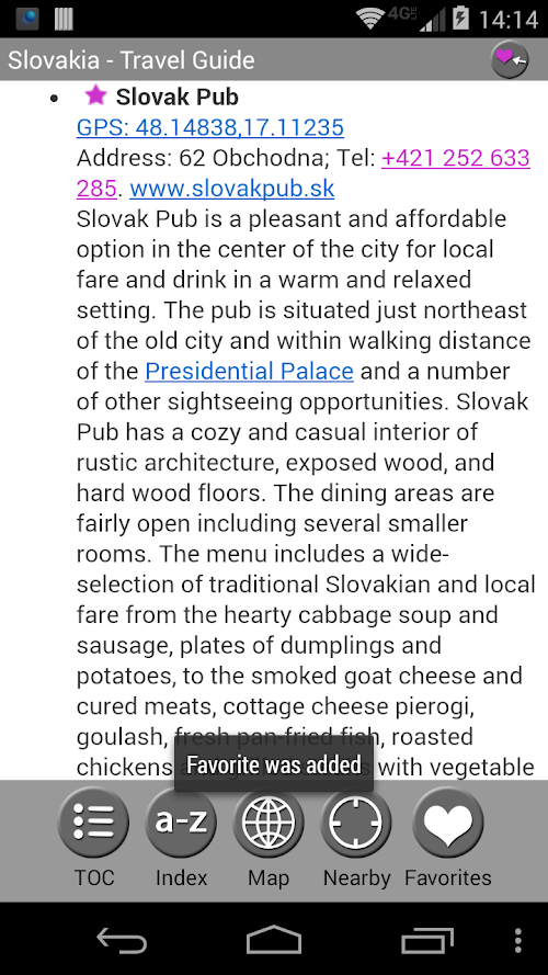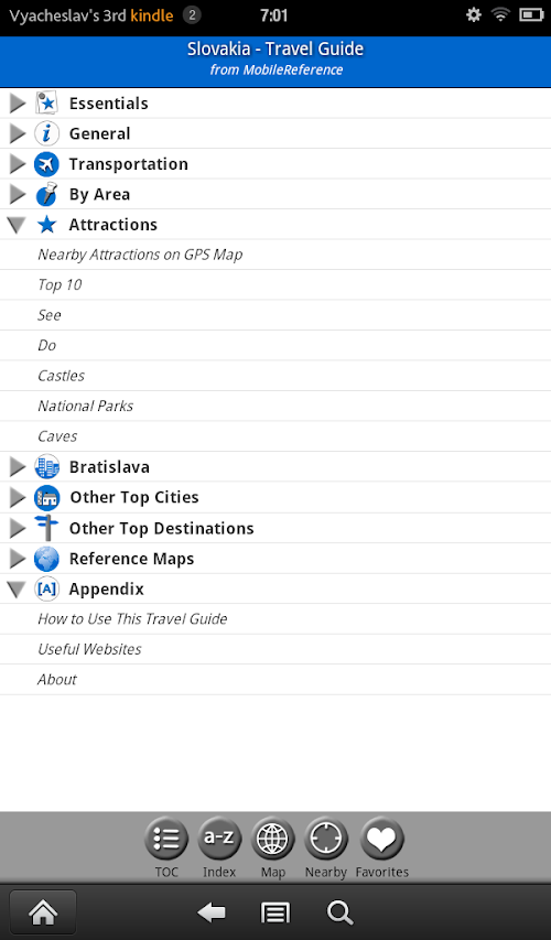 MobileReference Travel Guides provide detailed, practical information about attractions, landmarks, transportation, cultural venues, dining, lodging, history and much more. They are indexed alphabetically and by category, making it easier to access individual articles. Attractions can be viewed on an offline GPS map along with your current location so that you can easily find attractions near you as you explore the city.