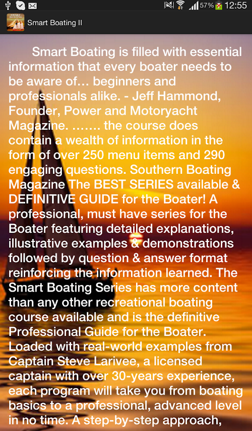 "Smart Boating is filled with essential information that every boater needs to be aware of… beginners and professionals alike." - Jeff Hammond, Founder, Power and Motoryacht Magazine. "……. the course does contain a wealth of information in the form of over 250 menu items and 290 engaging questions." Southern Boating Magazine