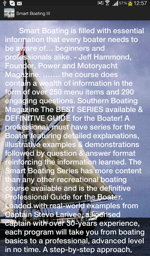 "Smart Boating is filled with essential information that every boater needs to be aware of… beginners and professionals alike." - Jeff Hammond, Founder, Power and Motoryacht Magazine. "……. the course does contain a wealth of information in the form of over 250 menu items and 290 engaging questions." Southern Boating Magazine