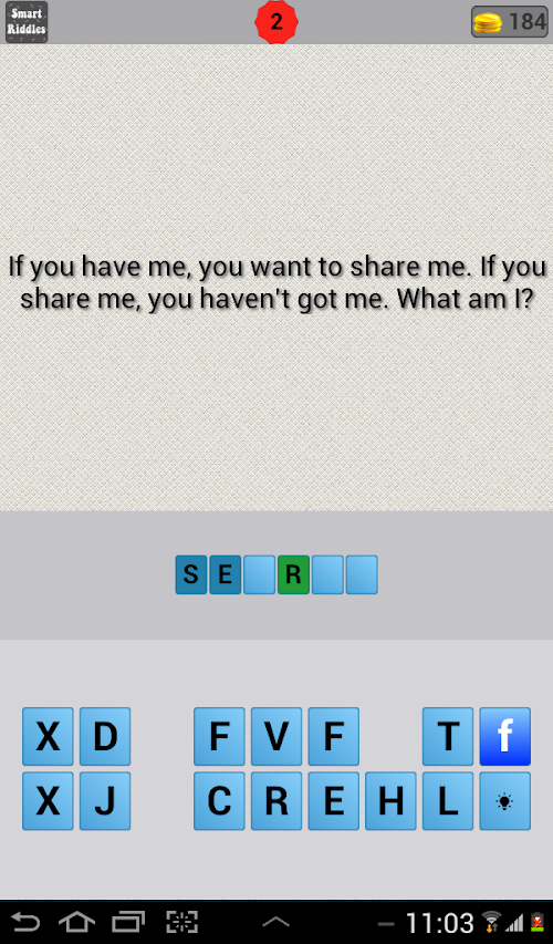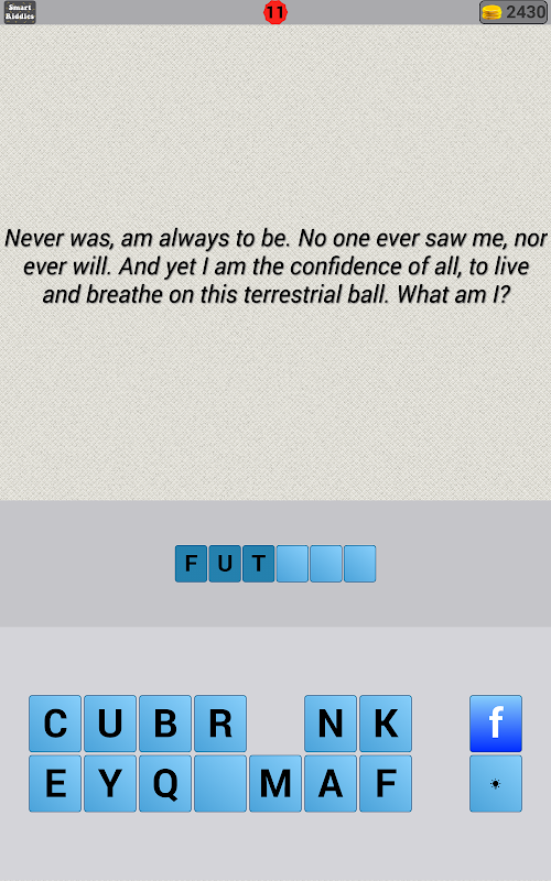 Collect coins for spending by guessing the answers, sharing with your friends, giving rate to the good riddle app or downloading a free game. The coins should be motivation so always try to give precise answers with least hints! Also spend your coins wisely.