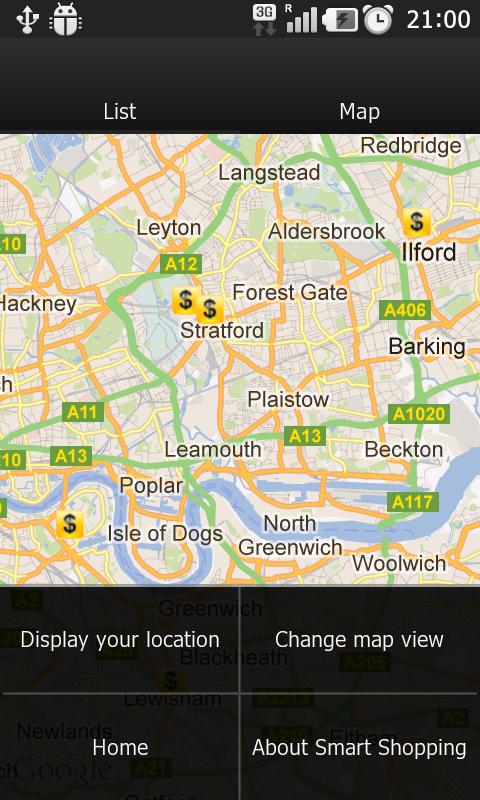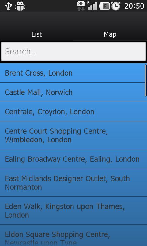 Smart Shopping shows stores and malls all across the UK that have generous sales and brilliant offers in a list format, in addition to the stores' location on a map in the application. Choosing a store or mall on the list will give you access to the associated offers. The list view of Smart Shopping gives the user an easy way to navigate through shops and shopping centers, either by browsing the list or by entering search criteria and retrieving relevant search results.