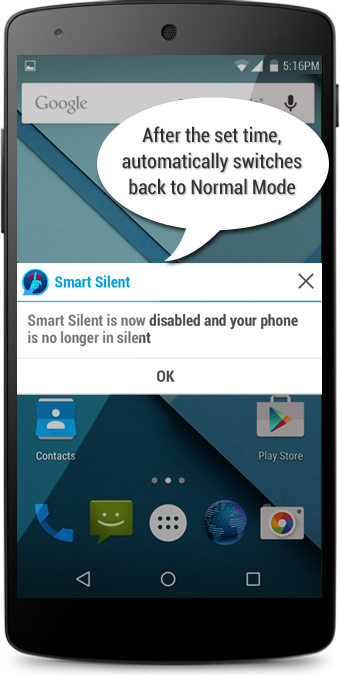 When you put your phone in silent mode, Smart Silent app offers you with Smart Silent timer feature. Once you set your silent mode duration, the app will automatically switch ON the Smart Silent mode. And after the expiry of silent mode period, it will automatically switch OFF the silent mode so that you can start receiving alerts & phone calls normally.