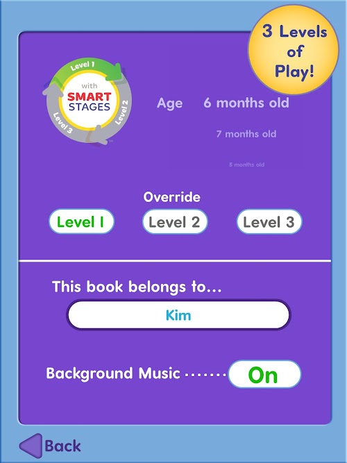 • Smart Stages™ technology: 3 Levels of content that grows with baby (Explore: 6 months, Encourage: 12 months, Pretend: 18 months); Mom can either select the appropriate age for their baby, or level that appropriately corresponds with their individual development