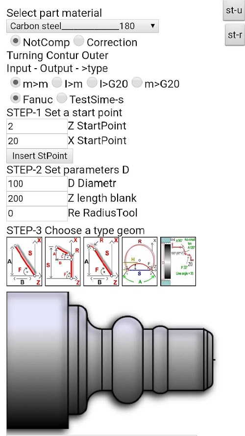 Interactive programming of TURNING CNC using a smartphone. Fast and convenient. It does not require large expenses and unnecessary efforts. Ideal for work and training. You can quickly perform complex calculations and you can save the program text in the / storage / MODULE_KJ / CNC directory.