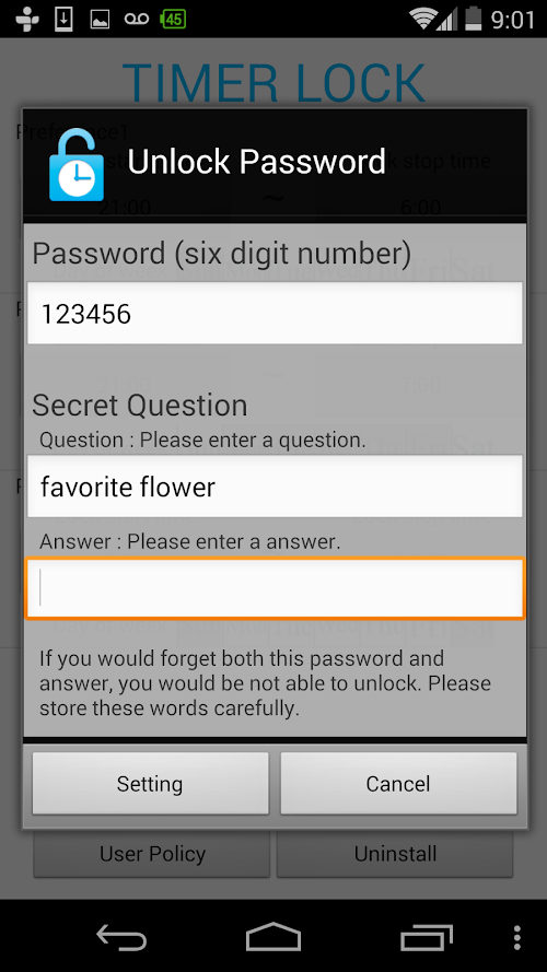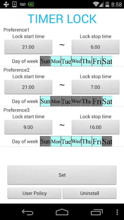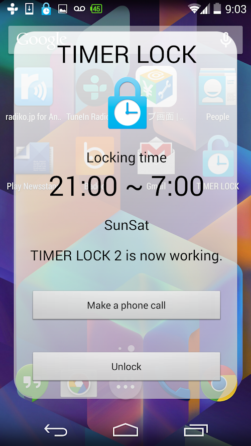 TIMER LOCK Multi-functional edition is an application designed to prevent children from becoming smart phone addicts, and installed in children’s smart phones by parents. Setting of days of the week and three types of time zones is possible. Once this TIMER LOCK application is installed, all other applications already installed are locked for a certain period of time. (Just in case of emergency, incoming and outgoing calls are not restricted.)