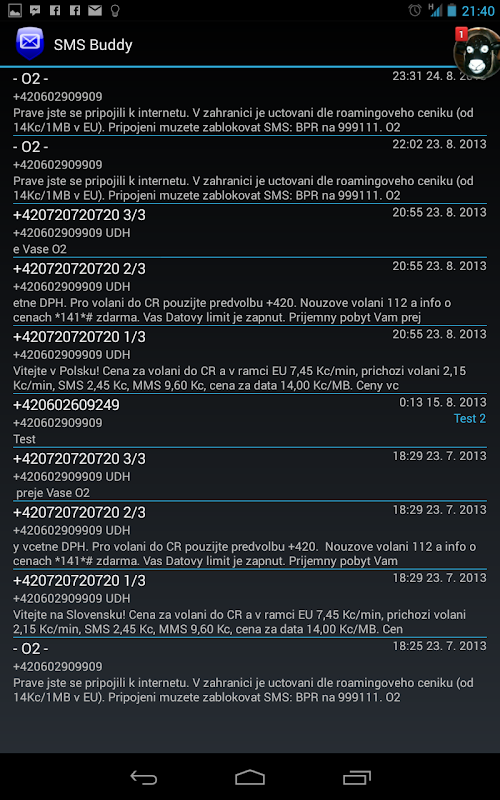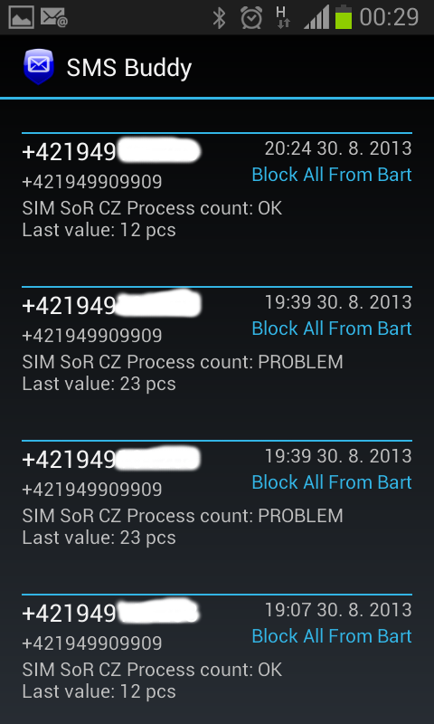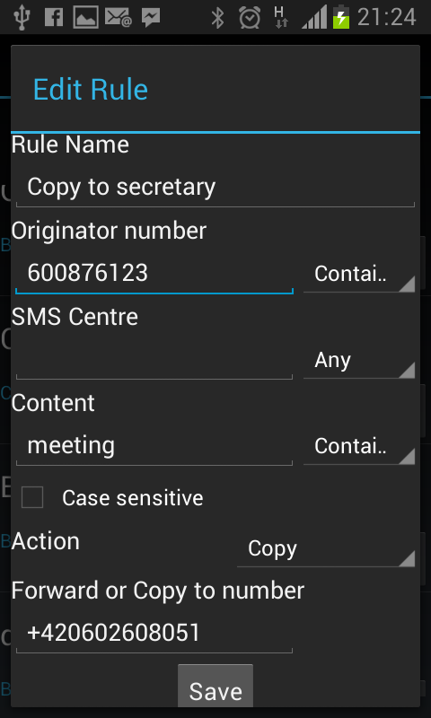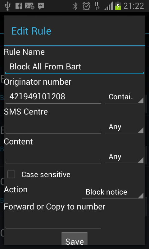 * Application evaluates each SMS (160 chars) separately. In case you receive long (concatenated) SMS and rule will match just its part it will be processed according to particular action. For example if long SMS will contain keyword in last part of it and it will be blocked it depends on SMS client how it will handle incomplete SMS.