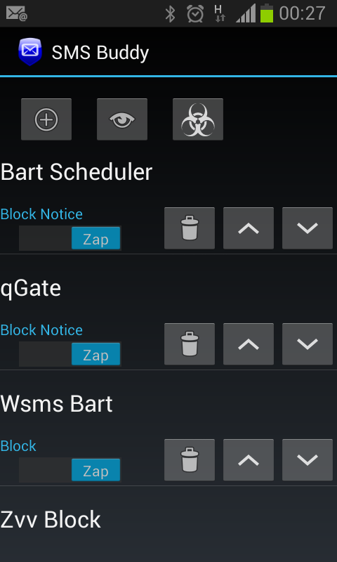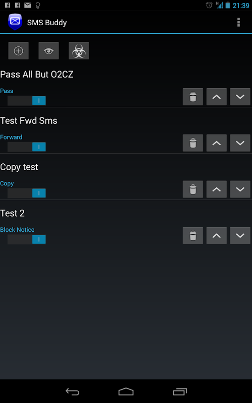 SMS Buddy is rule based SMS firewall and SMS management application for SMS spam or unwanted SMS blocking. You can apply rules on incoming text messages and secure your needs. There are SMS rules evaluated in order they are listed in main screen of SMS filter application. Each rule has condition and following action which you can combine as you like. Last messages are stored in log and blocked messages are in quarantine. SMS Filters are powerful, but think twice how you set-up SMS rules and rules order.