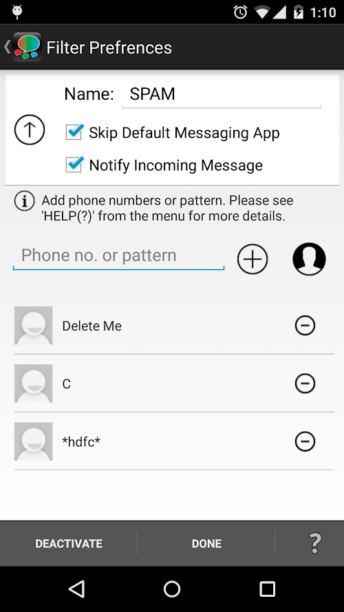 Some advertisement messages don't have phone numbers if you see the SMS details. The sender of these SMS es may be something like LM-XXXX or anything in text (not a proper number and the prefix varies most of the time). For this messages if you want to create a filter instead of specifying the numbers you can use a pattern like *xxxx*. The app will filter the message if it contains xxxx in the sender’s phone number.
