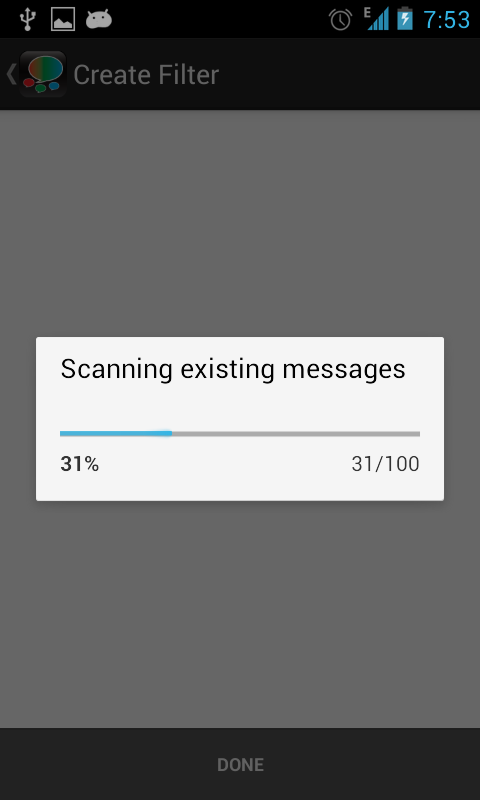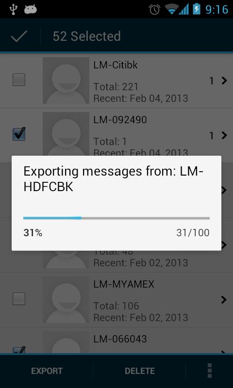 6) Scan Inbox: After creating a filter you can choose to scan the android's default messaging app for any SMS which match your filter criteria. You can delete the SMSes from the default messaging app and copy to the application and manage them from the app.(export them, delete them)