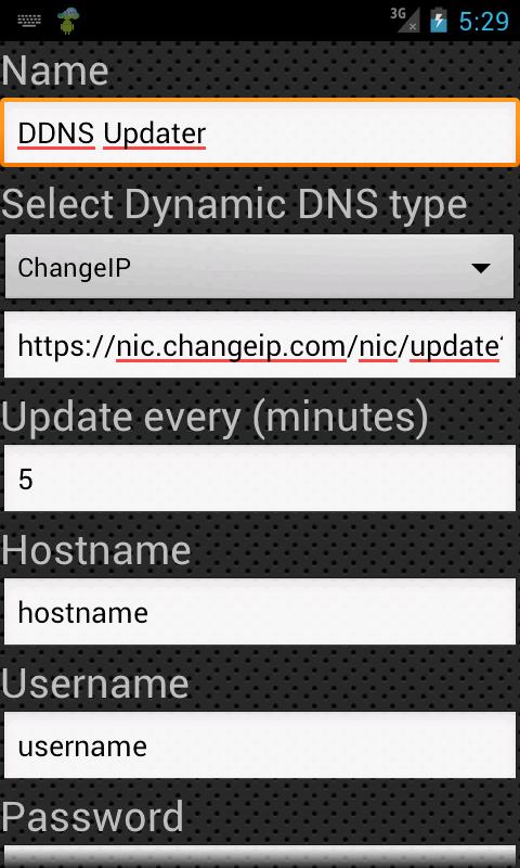- For every dynamic DNS updater set the name, timeout (in minutes), hostname, username, password and whether to update with the local or public IP address, start the Dynamic DNS Updater when connected to a specific WIFI network, update on connectivity change, start on boot