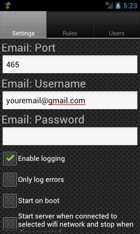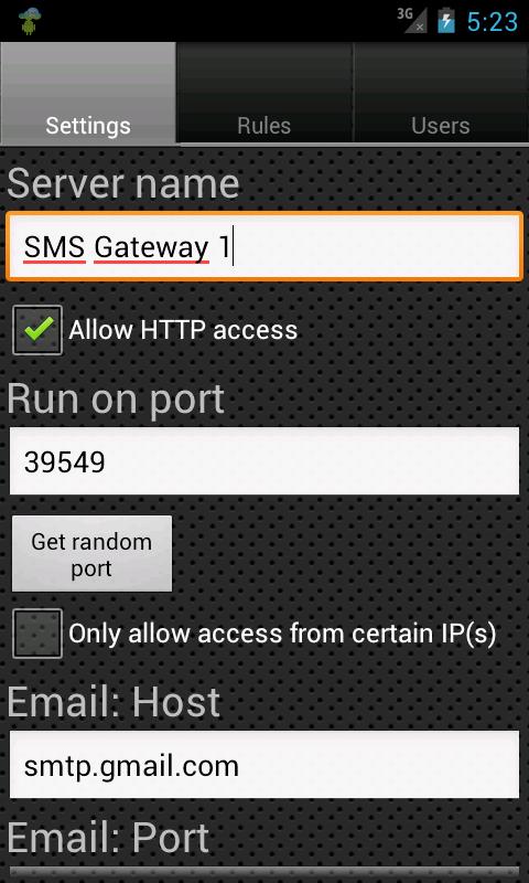 - For every SMS Gateway you can set the following: allow http access, http port, only allow access from certain IP’s, email settings (host, port, username, password) to send emails, enable logging, only log errors, start on boot, start/stop server when connected/disconnected to a specified WIFI network