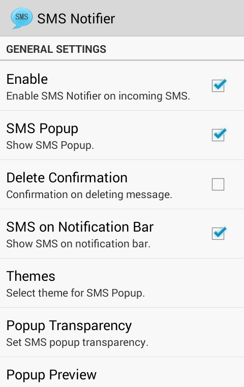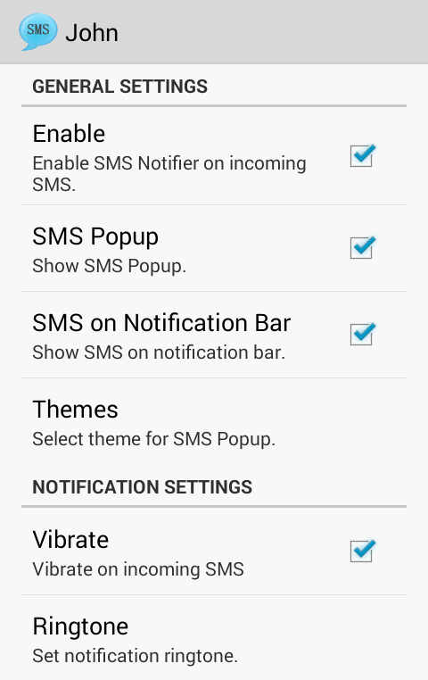 - Customize sms popup notification by setting vibration pattern or particular ringtone.