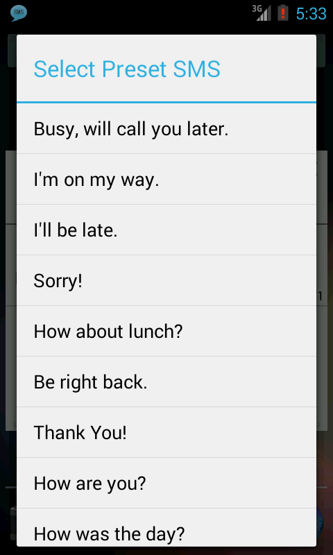 - Use your own or provided preset SMS for even quicker reply.