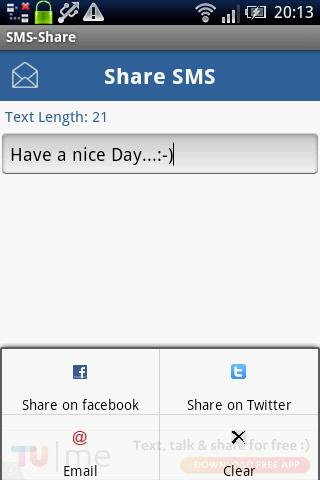 Here comes SMS-Share which will share/email your messages directly from your inbox to Facebook, Twitter, E-mail and many more on a single tap. SMS-Share will make your work more easy to be an active user of social site.