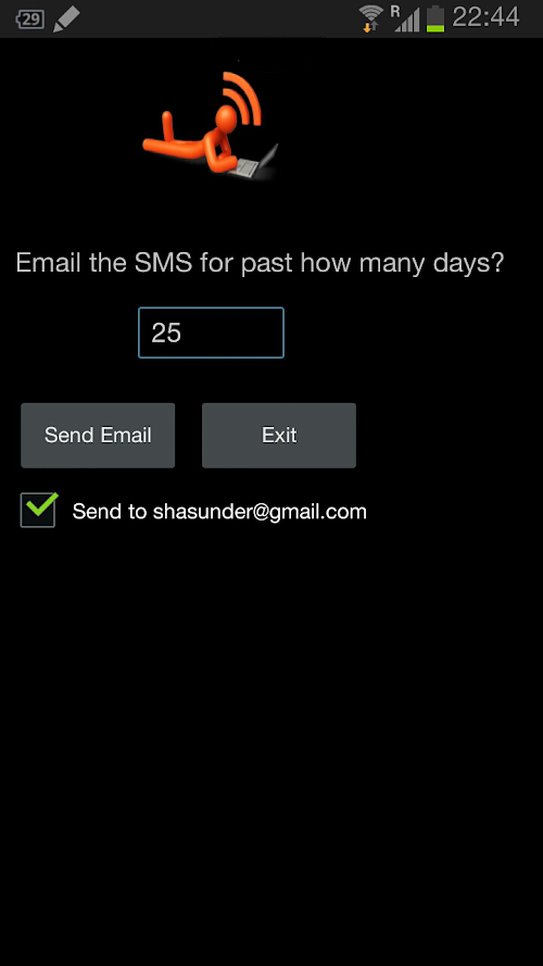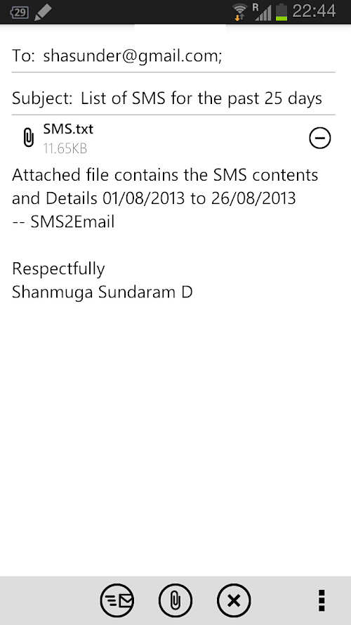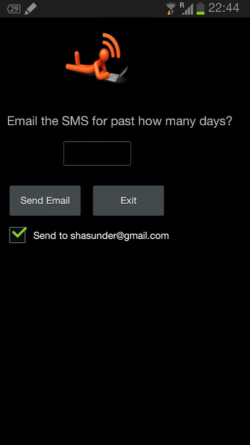Email all SMS (both Sent and Received) contents to the recipient. The user has the ability to select the number of days for which the sms should be sent to his email as attachment.