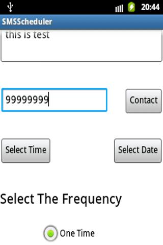 Here is the Android App for helping one to schedule his/her SMS. Using this app one can schedule, view or even cancel a scheduled SMS. He can send the SMS only for one time or can mention a predefined frequency for a repeated SMS. To list all the scheduled SMS and cancel any one of them the user will have to go through the menu button. This app has been open sourced and the source code can be cloned from https://github.com/sommukhopadhyay/SMSScheduler